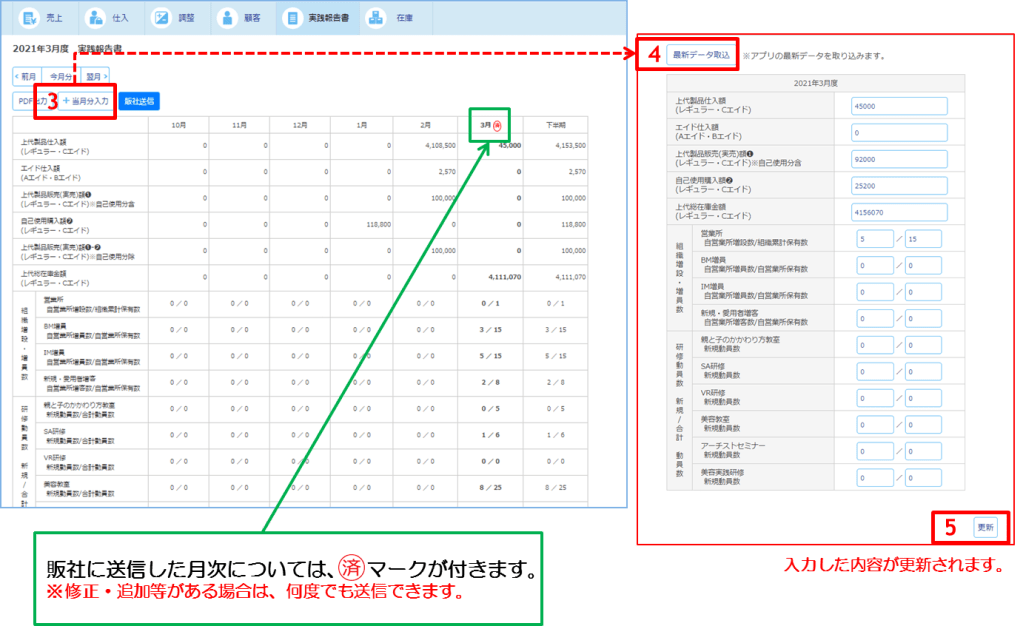 ※実践報告書の作成/送信には、締日を設けていないため、過去に遡って作業をしていただくことができます。また、販社に送信した実践報告書を修正して再送信することも可能です。ただし、再送信の際は、事前に販社にその旨をお伝えください。