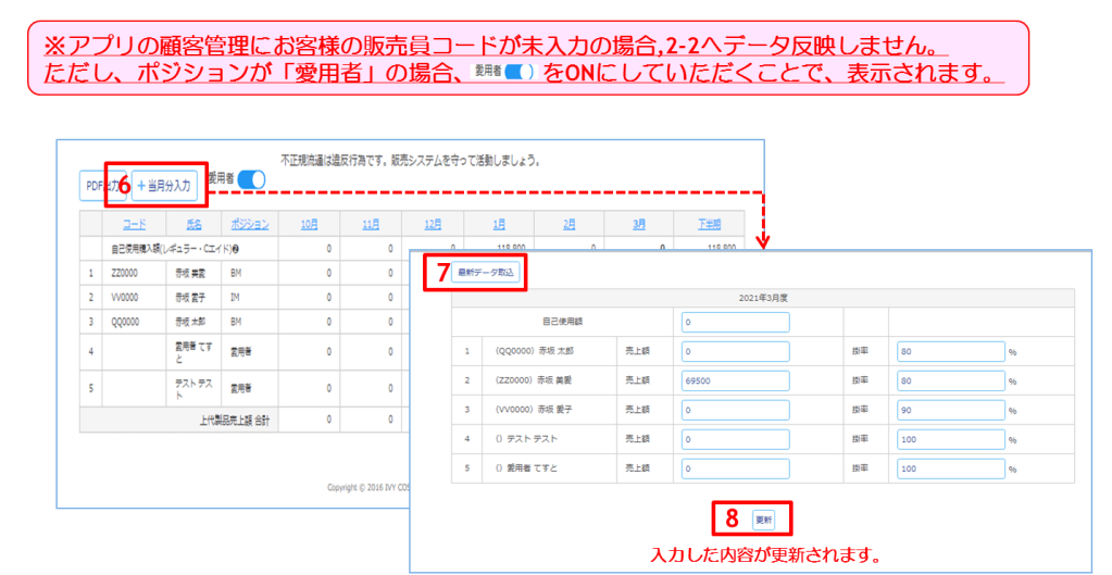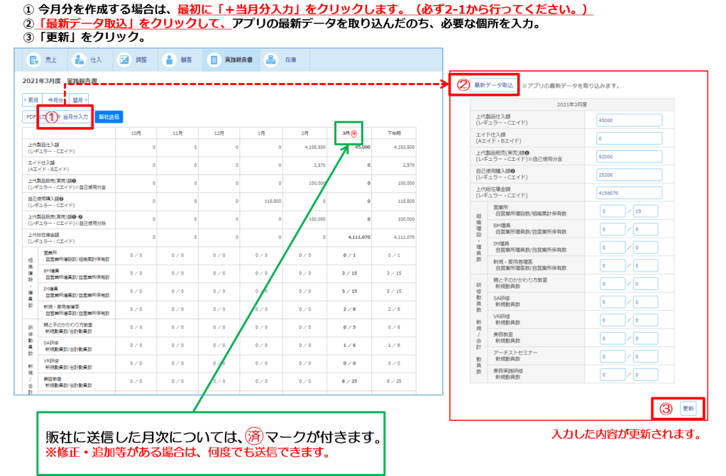 実践報告書を作成する際には、かならず2-1・2-2ともに「+当月分入力」から「最新データ取込」を行ってください。これを行っていただくことによって、アイビーレジに入力したデータが漏れなく実践報告書に反映されます。(※2-1から行っていただかないと、2-2のデータが反映されないことがございますので、順番に気を付けてください。)