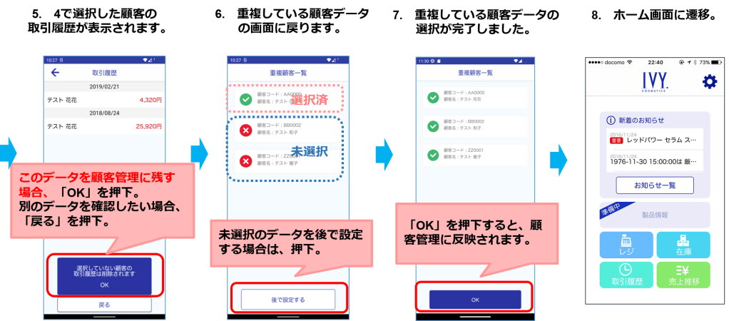 以前より一部の販売員様のアイビーレジの顧客管理におきまして、同一の顧客データが重複して表示されるという事象が発生しておりました。この事象の修正を行うため、また、アイビーレジの利便性向上を図るために、この度、アイビーレジアプリにおきまして「重複顧客の表示選択」機能を追加しました。