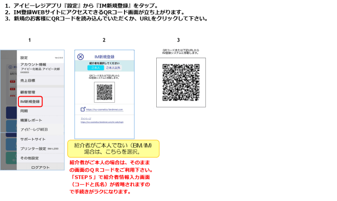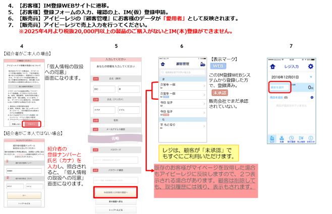 アイビーレジのシステム構築の便宜上、(仮)登録、(本)登録としています。これまではアイビーレジで「愛用者」に販売を行う場合は、手入力で顧客データを入れていただき売上入力をする必要がありました。今後は、顧客にIM(仮)登録をしていただくと、即時にアイビーレジに顧客データが反映されますので、スムーズに売上入力ができるようになります。また、必要に応じて、その場でIM(本)登録にも進んでいただけます。ぜひご活用ください!!
